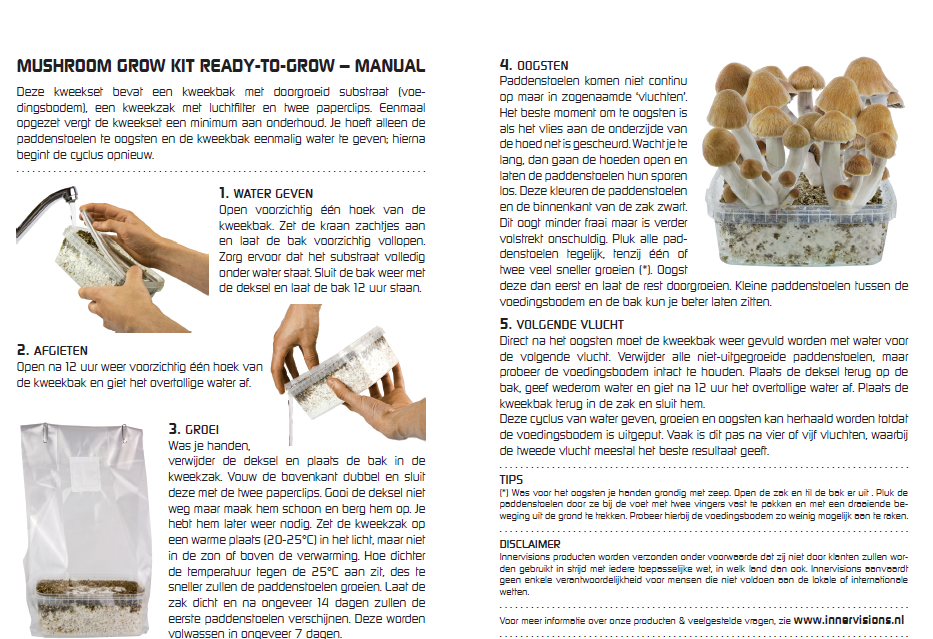 Het kweken van paddo's is niet moeilijk maar er komen wel enkele zeer belangrijke stappen bij kijken die je zeker niet mag ontlopen. Voor het kweken van de paddestoelen hebben wij op deze pagina voor elke kweekset een handleiding staan die je kunt downloaden of uitprinten. Het belangrijkste voor het kweken van paddo's is het hygienisch werken en een beetje geduld, als je dit voor elkaar krijgt heb je het proces al voor 95% voltooit, je hoeft ze nu alleen nog maar te plukken.