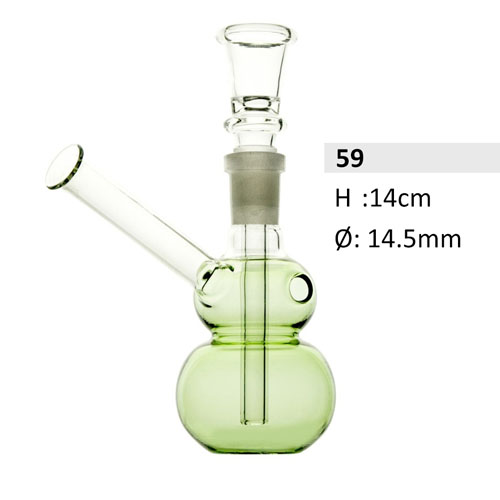De double bubble vorm geeft deze waterpijp zijn karakter: de grote bolbodem bevat het waterreservoir dat rook koelt en filtert, de kleinere knobbel daarboven fungeert als extra buffer en versterkt de waterfiltratiewerking. Het zijwaarts geplaatste mondstuk zorgt voor een lage, comfortabele trekpositie zonder omhoog te hoeven kijken. Bovenaan zit het 14,5 mm slijpstuk met een transparante trechterkom.