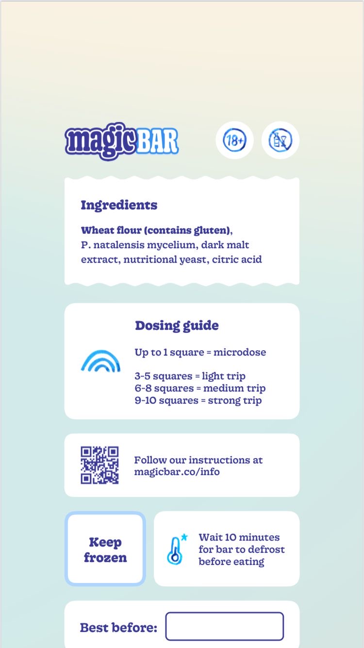 Combineer de Magic Bar niet met alcohol, MAO-remmers of andere psychoactieve stoffen. Gebruik niet bij psychische kwetsbaarheid of een persoonlijke of familiegeschiedenis van psychose. Alleen voor personen van 18 jaar en ouder.