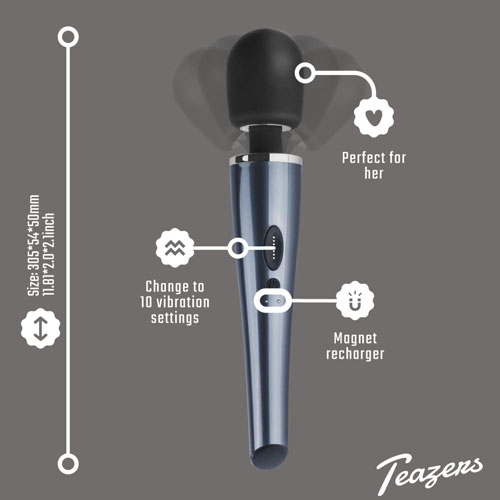 Merk: Teazers Kleur: zwart Gewicht: 384 gram Vibratiestanden: 5 snelheden + 5 patronen Bediening: drukknopjes op het handvat Voeding: USB-oplaadbaar (kabel meegeleverd) Waterbestendigheid: spatwaterdicht Geschikt glijmiddel: waterbasis Stimulatiedoel: clitoraal, lichaamsmassage Gebruikersniveau: beginner Unisex: ja