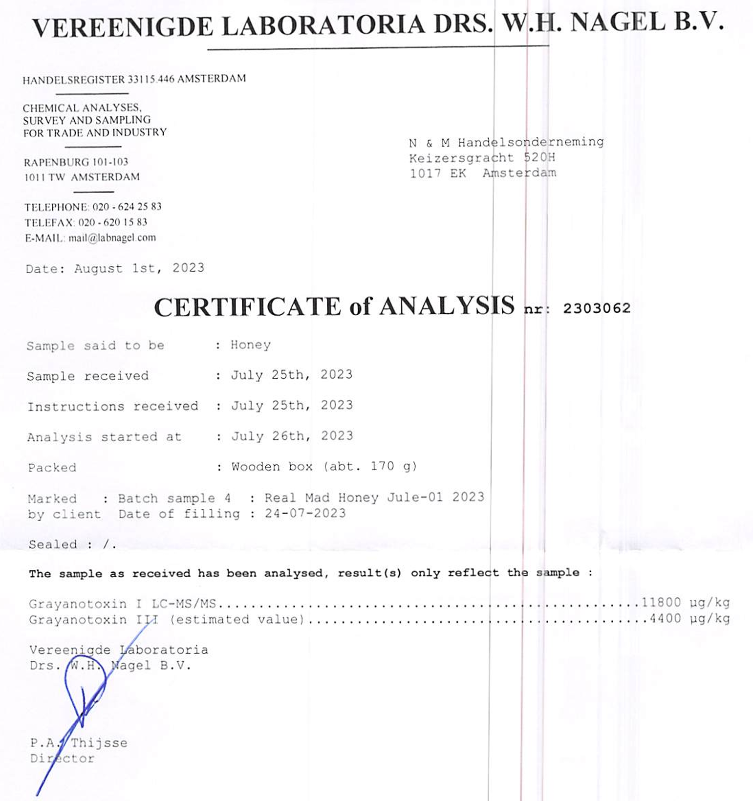 • Real Mad Honey, rechtstreeks uit Turkije, is een bijzondere honingsoort met een opmerkelijk karakter. Deze honing bevat de natuurlijke stof grayanotoxine, afkomstig uit de nectar van de rododendronplant. Wanneer je Real Mad Honey consumeert, kun je een bijzondere, intensieve ervaring ondergaan. De honing wordt op traditionele wijze verzameld door kleine, lokale imkers in Turkije.
